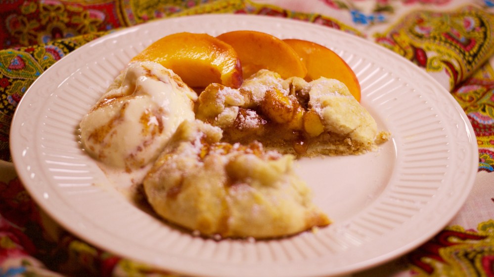 Spoon the peaches evenly among the circles and then fold the edges of the crust to create a fence around the filling. Brush the crust with an egg wash, sprinkle with sugar, and then spoon the remaining peach juice from the bowl over the tartlets. Bake for 25 minutes.